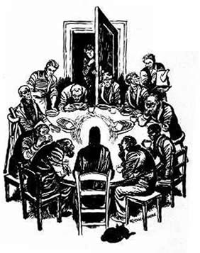 This image of the last supper was published in The Catholic Worker in 1951. This image shows Christ at a round table. This is intentional as it removes the need for special or hierarchical seating. It is multi-cultural. The twelve come from ‘every race and nation.’ It sees no age, there are young and old alike in here. Economic status is not a factor. Sadly, there are only men around this table. I suspect if Eichenberg were sketching this today and not in 1951, there would be men and women around the table. The spirit of this work is really rooted in the idea that all manner of human being is welcomed at the table. As we gather on a Sunday or on a Wednesday (or on whatever day is customary for you to gather) we can look around the table and hopefully see that we all bring our own gifts and challenges to the table.