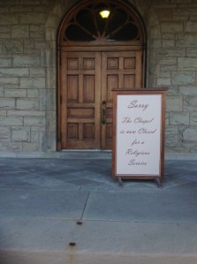 The chapel is now CLOSED for a “RELIGIOUS SERVICE!” I could not resist taking this photo. Being a priest of the church I was not shy about walking past the sign toward the inviting sounds of Angus Sinclar’s music and the unified voices of the clergy of our Diocese in song. When I got inside I thought, is that sign just another way of saying – Do not disturb! It was crafty to use such soft colour tones and such a pretty font, but the message here is not subtle; “The religious people are praying, come back when we are done.” It may as well say – Do not disturb, we are disturbed enough already.