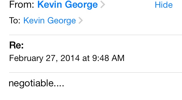 A few moments later in a follow up email the hacker showed his/her reasonable side with a one word email…. “Negotiable.”