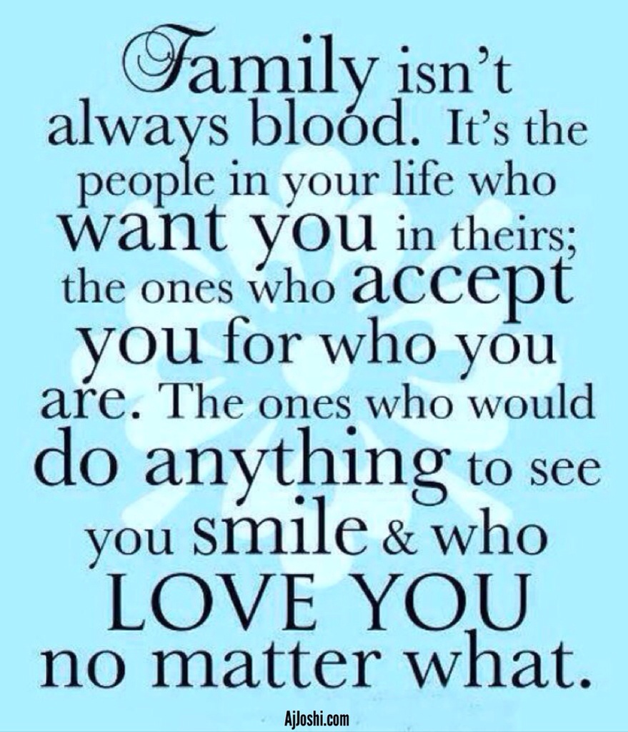 Family is always blood. Family are the people we have in our tribe because God gave us to them and them to us. They are the ones who accept you for who you are, or perhaps not – but stick with you anyway. They are the ones who are happy to see you smile but also care enough to tell you the truth in love, even when it hurts. They are the ones who also don’t run when you are no longer smiling. They are those who step toward your collapsing life while others are running in the other direction because it is to hard for them. They love you no matter how difficult and nutty you may be.